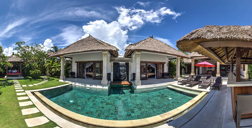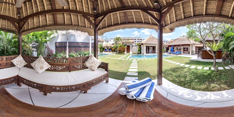 Virtual Tour created for Villa Ke Bali in Seminyak, Bali. The villa is expansive and it has a wonderful master bedroom with a private kitchen area. The master bedroom can almost be used as a standalone 1 bedroom villa within the complex. Also look at the 360 degree photograph in the tour that was shot over the table.