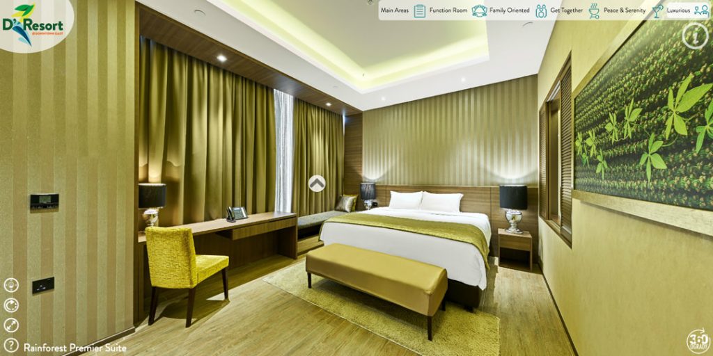 Interactive 360 Degree Virtual Tour for D Resort at Downtown East in Singapore. The Virtual Tour consists of 71 individual 360 points. The tour includes 12 room types including two suites, two bbq areas, 3 conference room types with one solemnisation and the lobby with rainforest plaza.